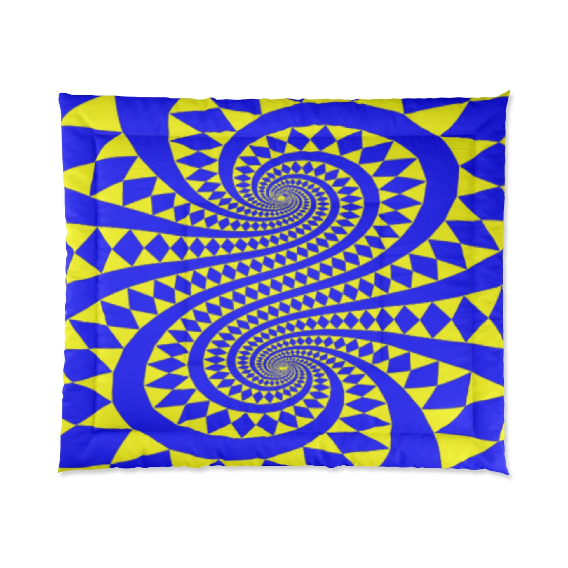 Edredón con diseño elegante de espirales en azul y amarillo. Diseño personalizado. Coloque el edredón sobre la cama. Vea las colecciones, tiene patrones a juego. Colores únicos. Te acurrucarás y te mantendrás abrigado.
