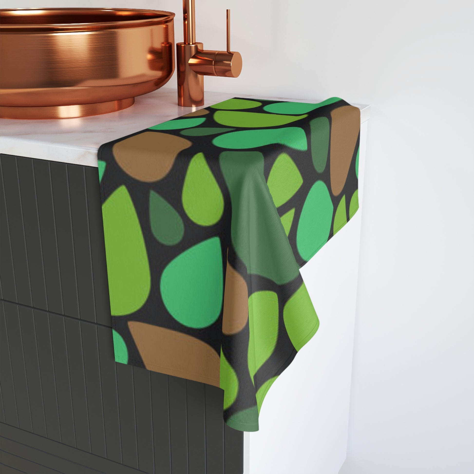 Larmes vertes et brunes. Serviette à main. Œuvre d'art personnalisée. Flare fantaisiste unique. Couleurs vives. Doux contre votre peau. Ajout d'une touche de couleur. Essuyez vos mains après les avoir lavées au savon. J'adore le vert de cette serviette à main.