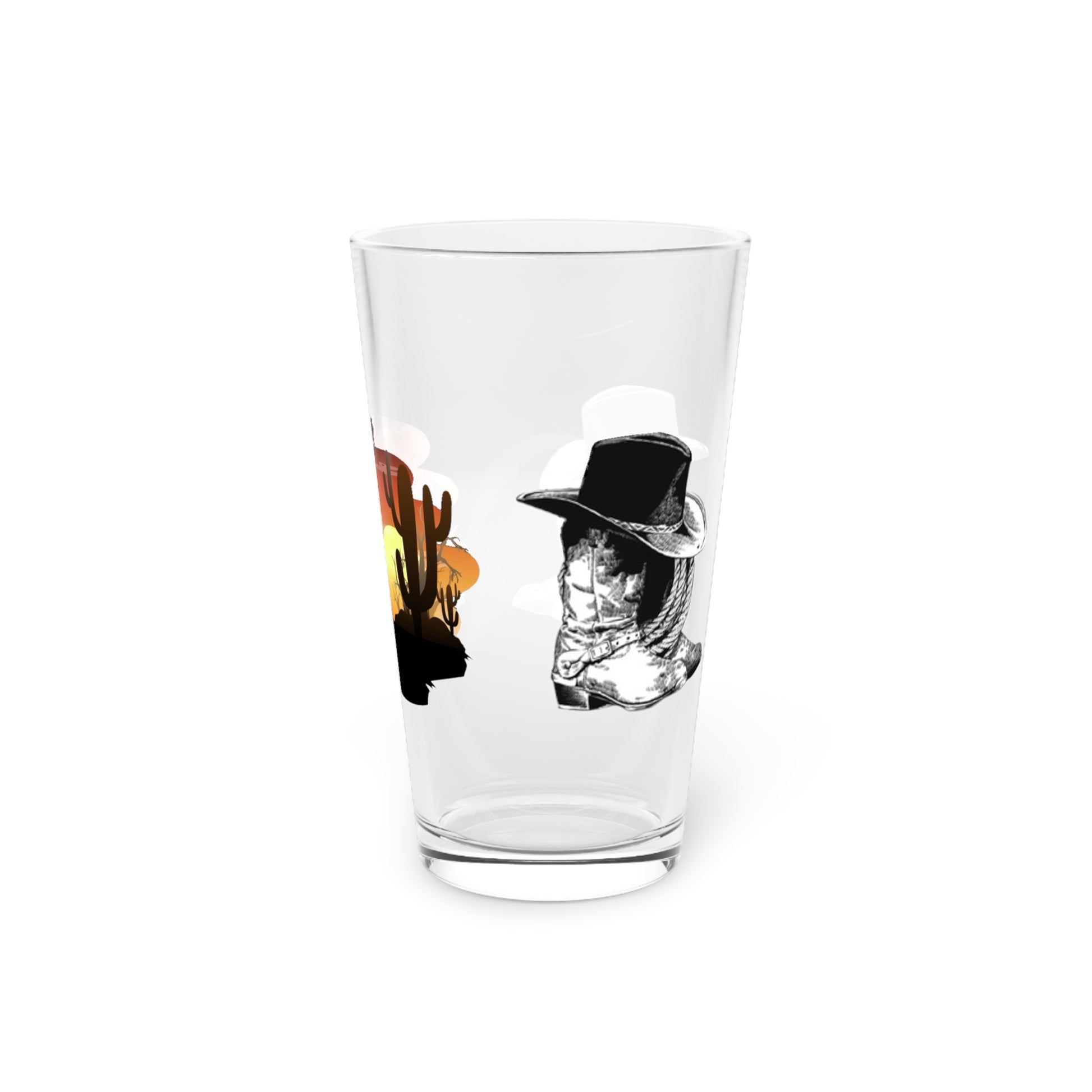 Desert Sunset. Pint Glass. Size: 16oz. Custom Artwork. Vivid Colors. Great for every Kitchen. Looks fabulous for parties, casual dinner & relaxing. Fill will a tasty beverage.