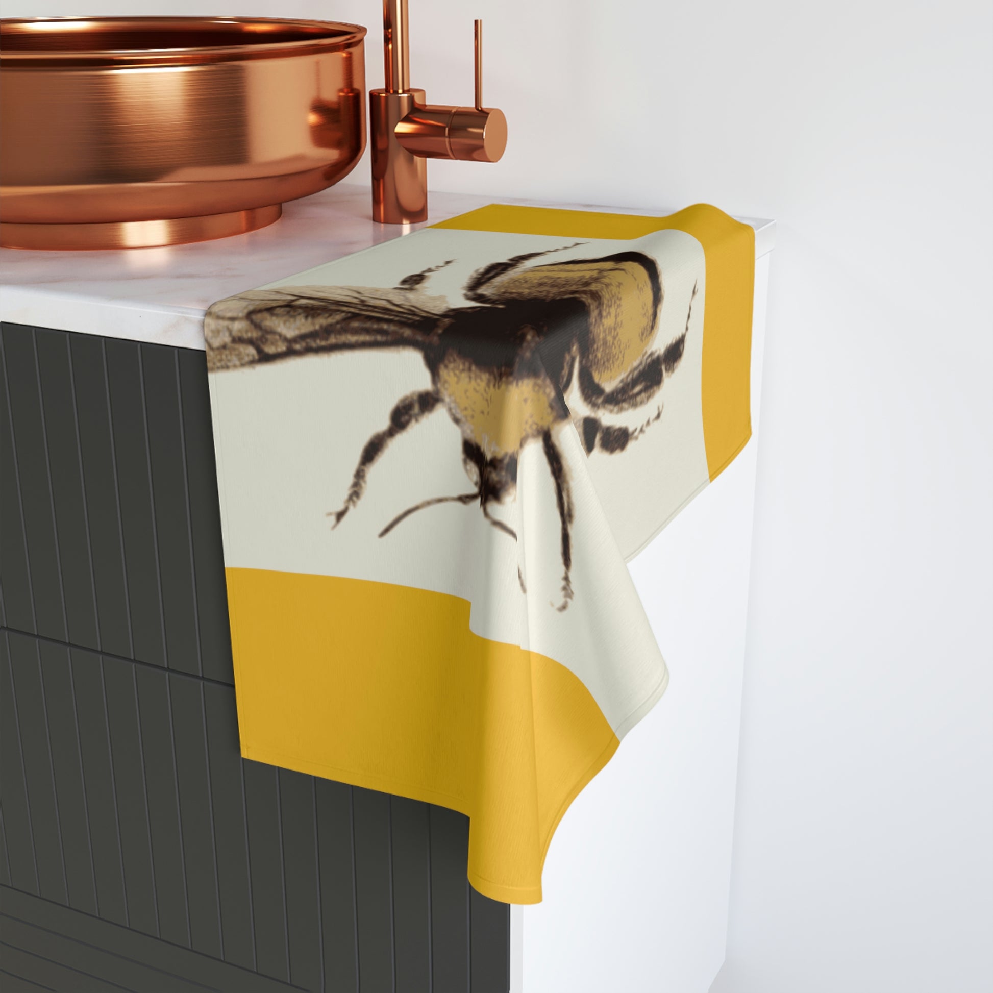 Bumble Bee. Hand Towel. Custom Artwork. Unique Whimsical Flare. Vivid Colors. Great to have in every bathroom of your home and business. Soft against your skin. Adding a splash of color. Helping to keep your face and hands clean.