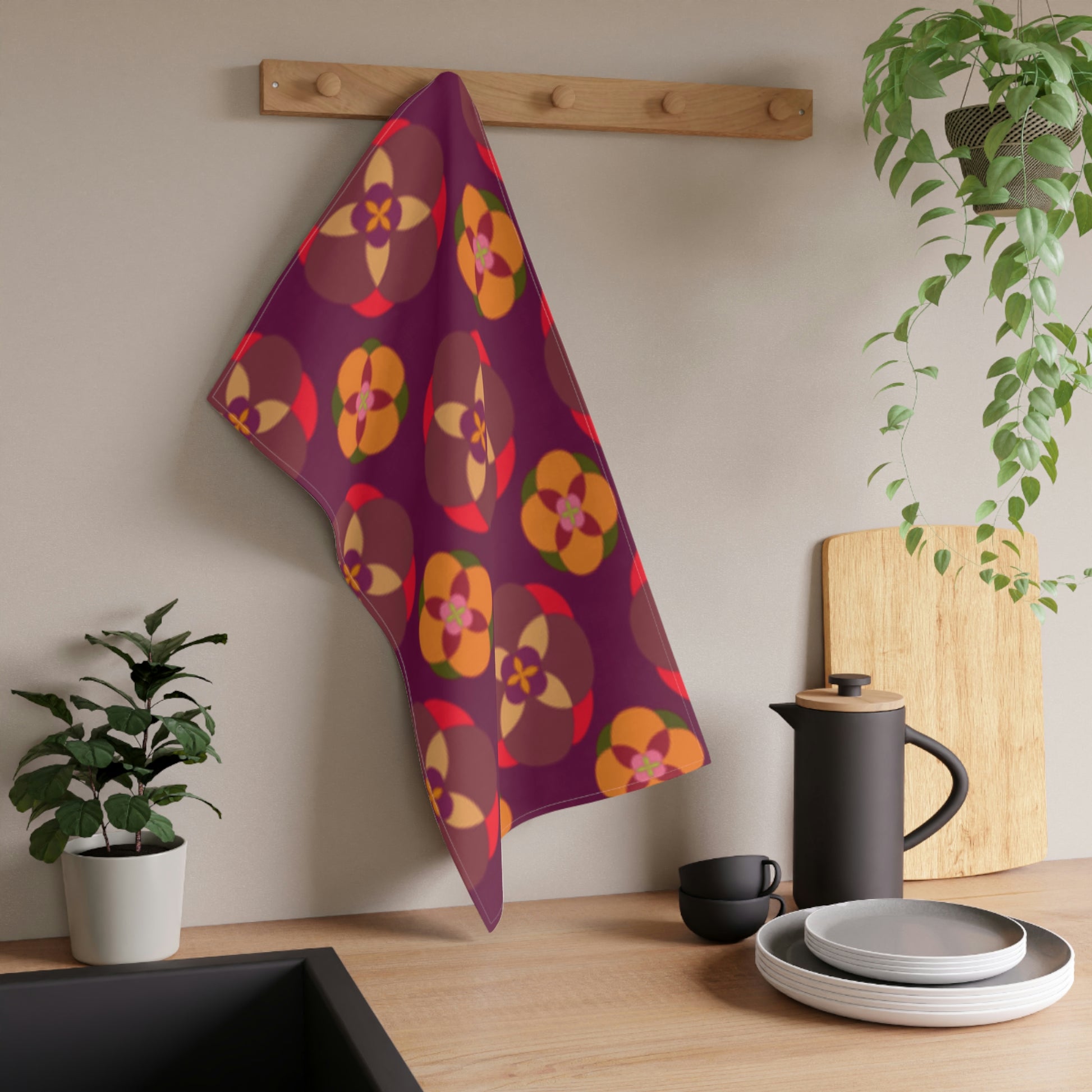 Purple with Circles. Kitchen Towel. Custom Artwork. Unique Whimsical Flare. Vivid Colors. Great to have in your kitchen. Soft against your skin. Adding a splash of color. Clean up spills, drying hands, drying dishes or use as place mat. I Love this kitchen towel!