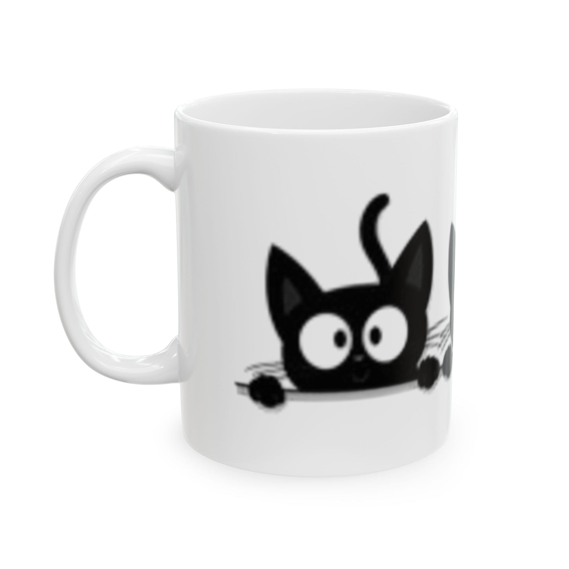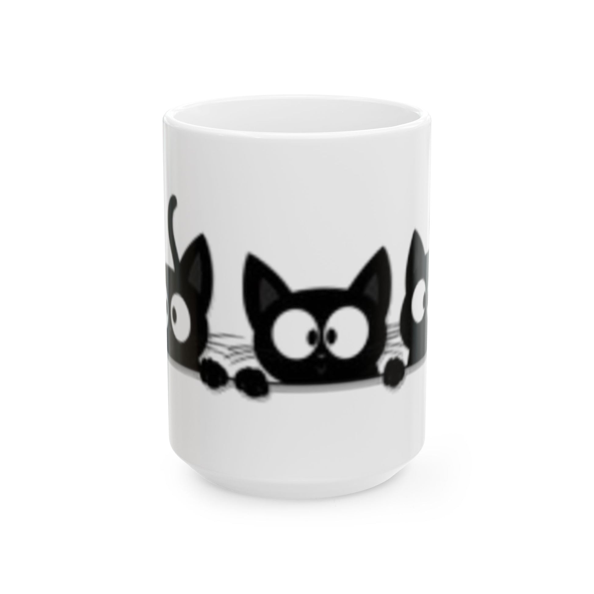Three Black Cats with Large Eyes. 11oz, 15ox Ceramic Mugs. Custom Artwork. Fill with your favorite beverage.